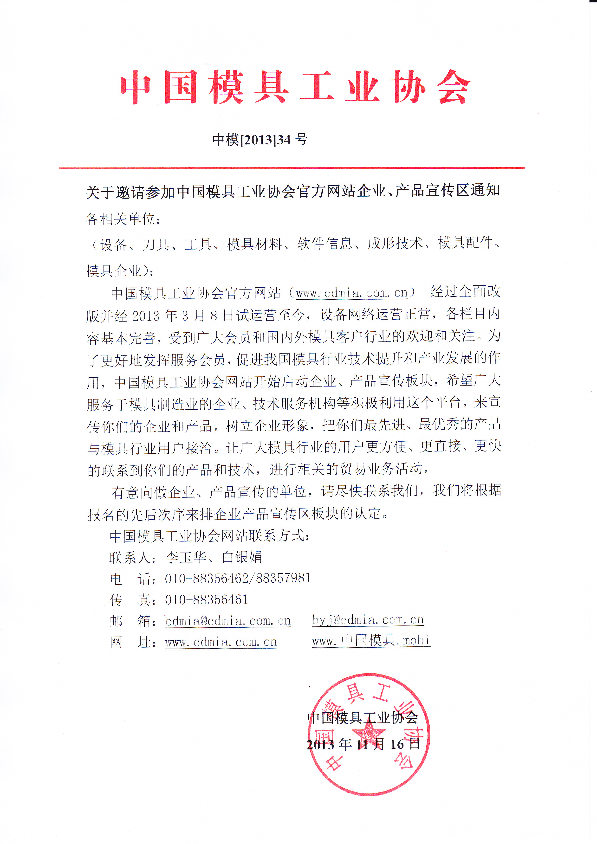 關于邀請參加中國模具工業協會官方網站企業、產品宣傳區通知