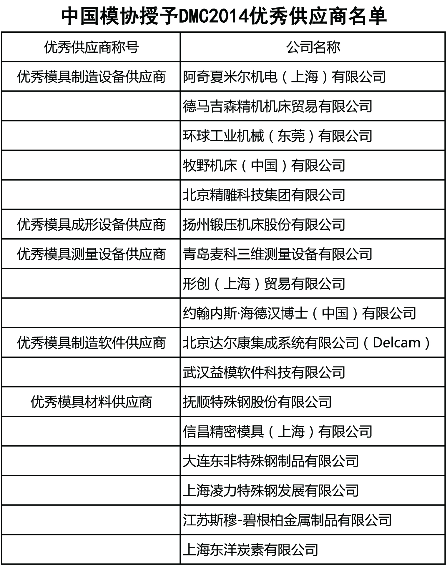中國模具工業協會授予DMC2014優秀供應商名單
