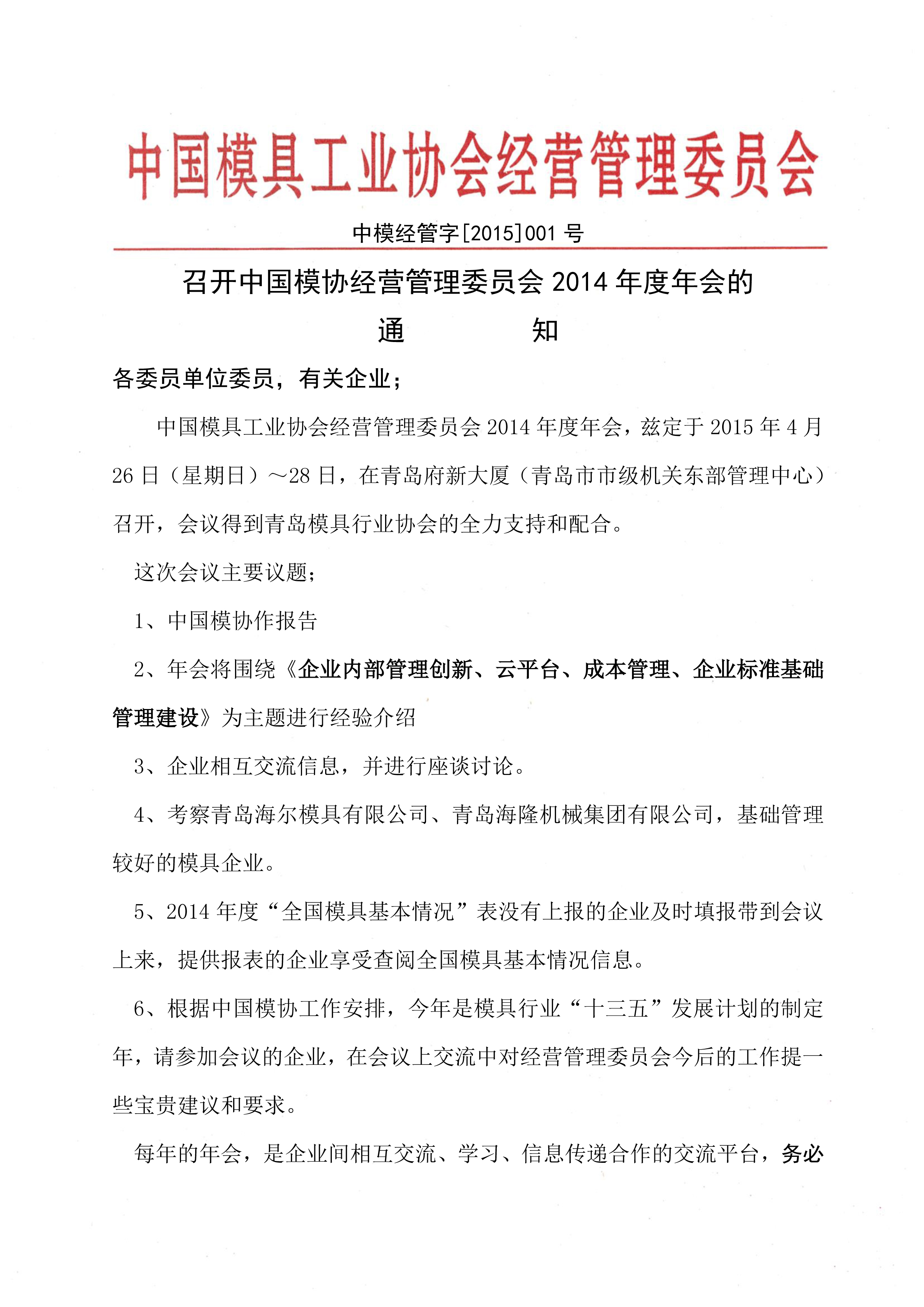 召開中國模協經營管理委員會2014年度年會的通知