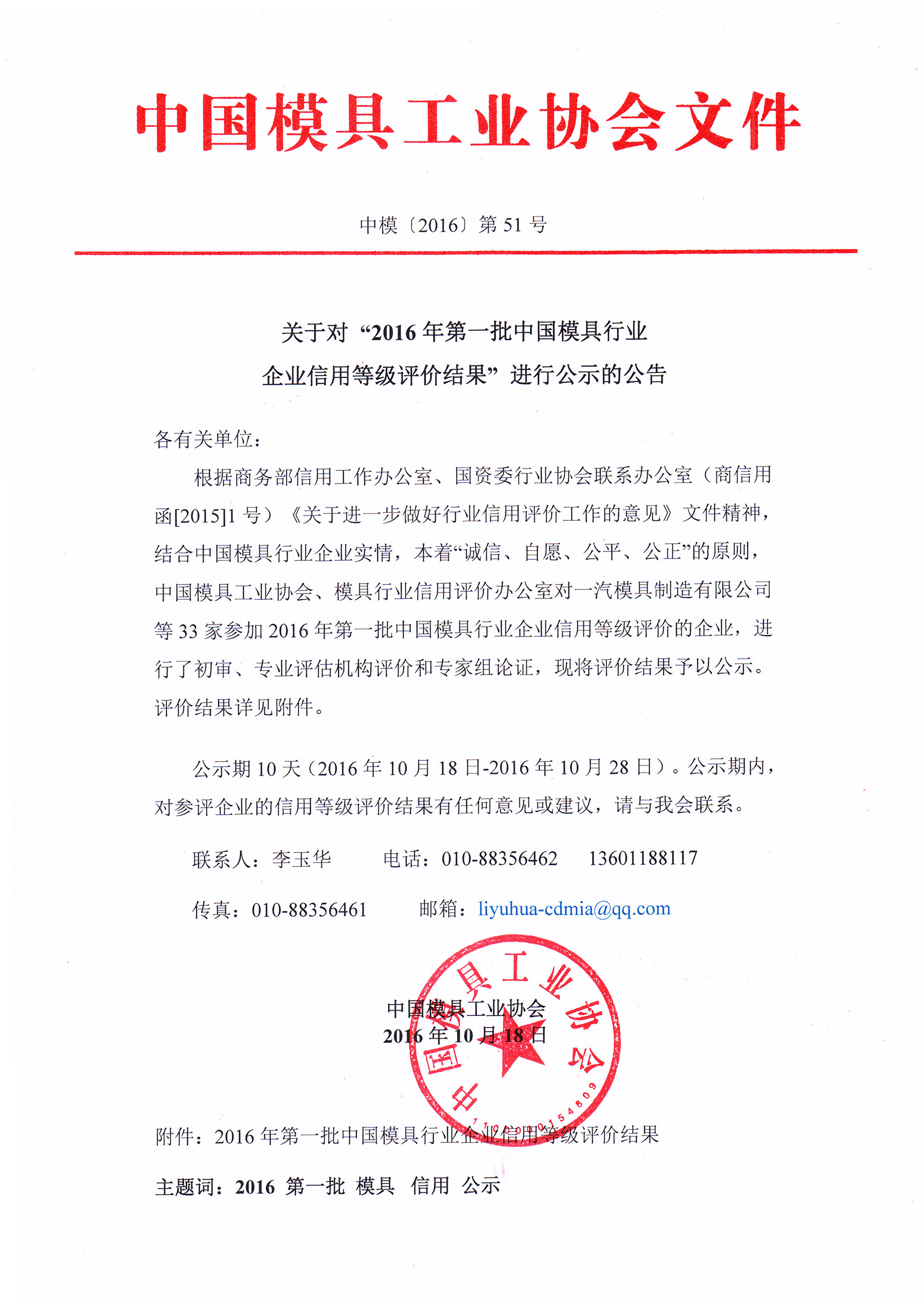 關于對“2016年第一批中國模具行業企業信用等級評價結果”進行公示的公告