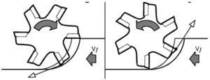 在高切削加工中,應盡量選用順銑加工,因為在順銑時,刀具剛切入工件產生的切屑厚度為最大,隨后逐漸減小。在逆銑時,刀具剛切入工件產生的切屑厚度為最小,隨后逐漸增厚,這樣增加了刀具與工件的摩擦,在刀刃上產生大量熱,所以在逆銑中產生的熱量比在順銑時多很多,徑向力也大大增加,緩解了高硬度切削時切削熱對刀具的損傷。同時在逆銑中刀刃受力狀態較順銑更為惡劣,降低了刀片的使用壽命,順銑和逆銑時刀具切入工件的過程,如圖(二)所示。