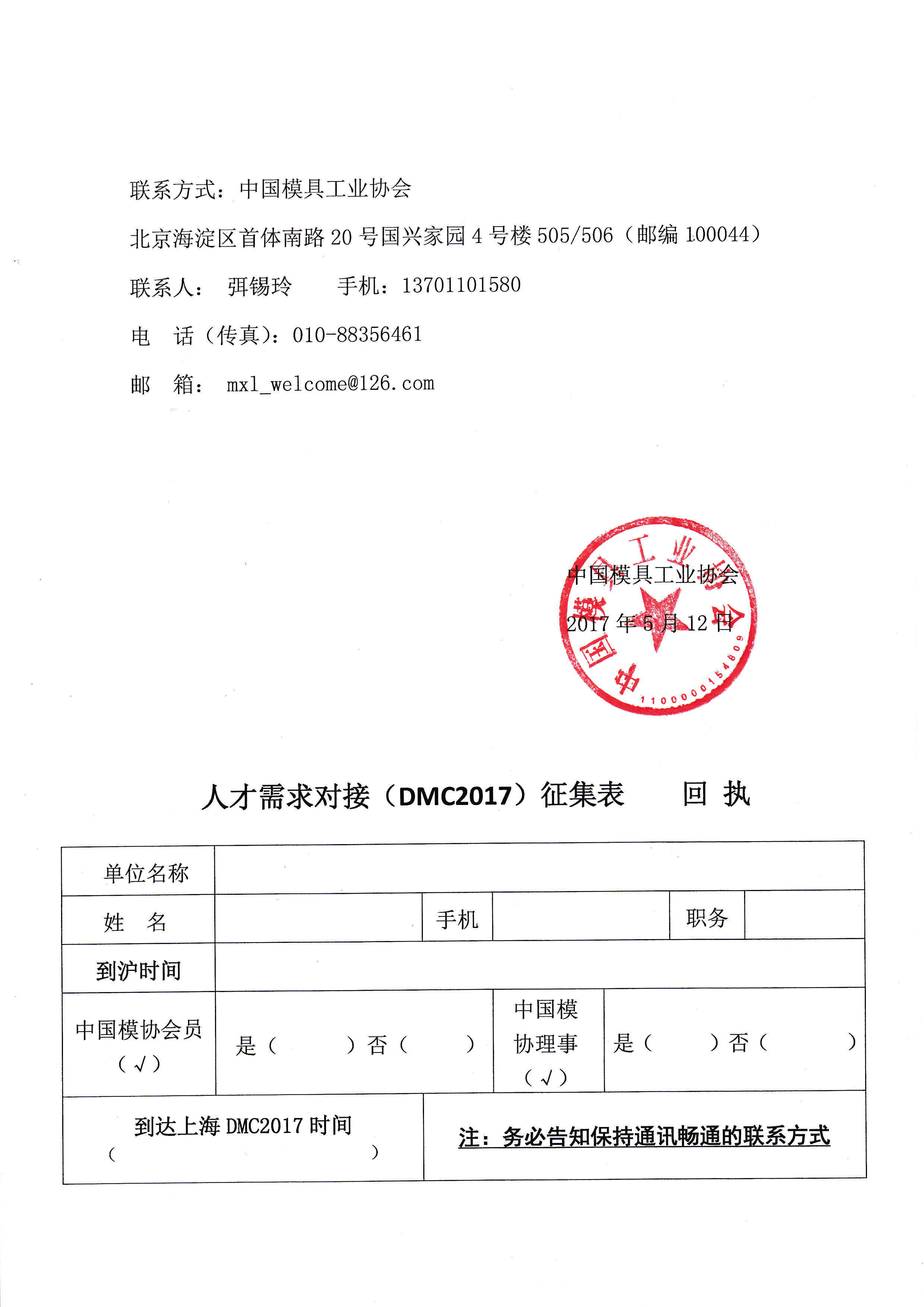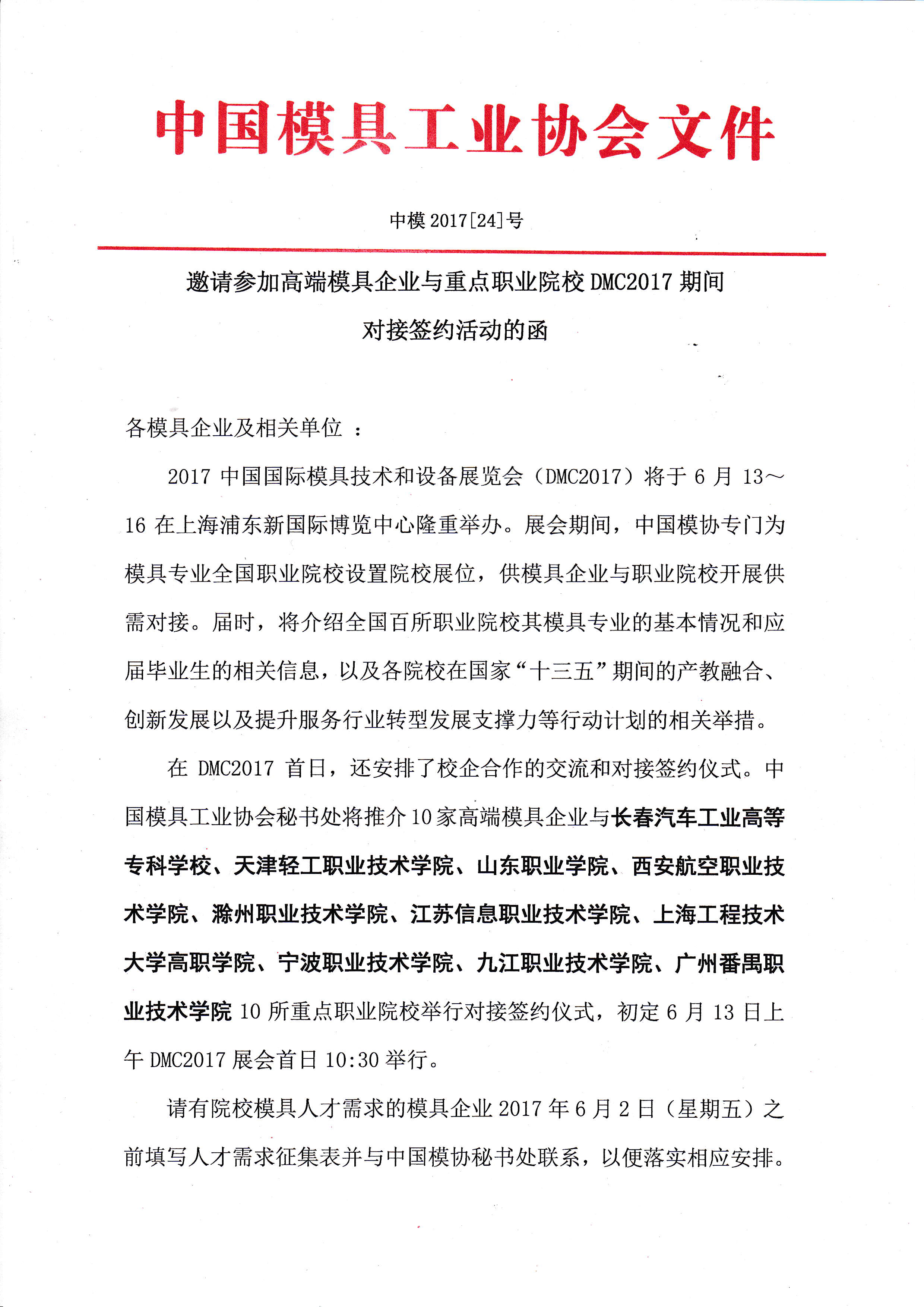 邀請(qǐng)參加高端模具企業(yè)與重點(diǎn)職業(yè)院校DMC2017期間對(duì)接簽約活動(dòng)的函