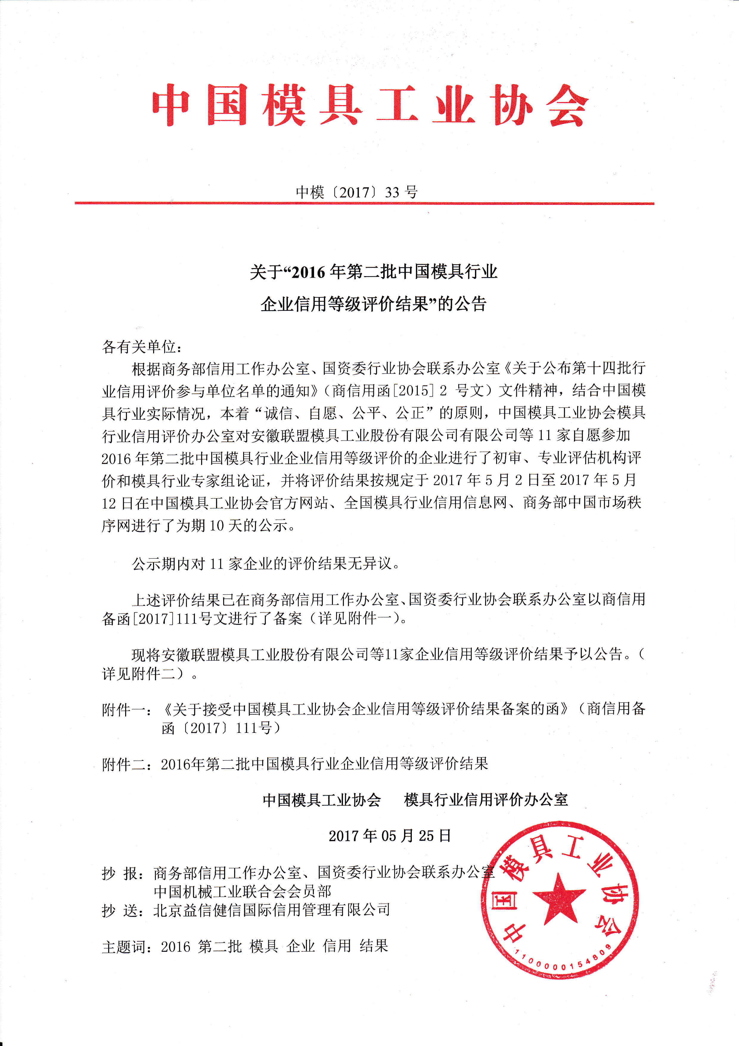 關于“2016年第二批中國模具行業企業信用等級評價結果”的公告