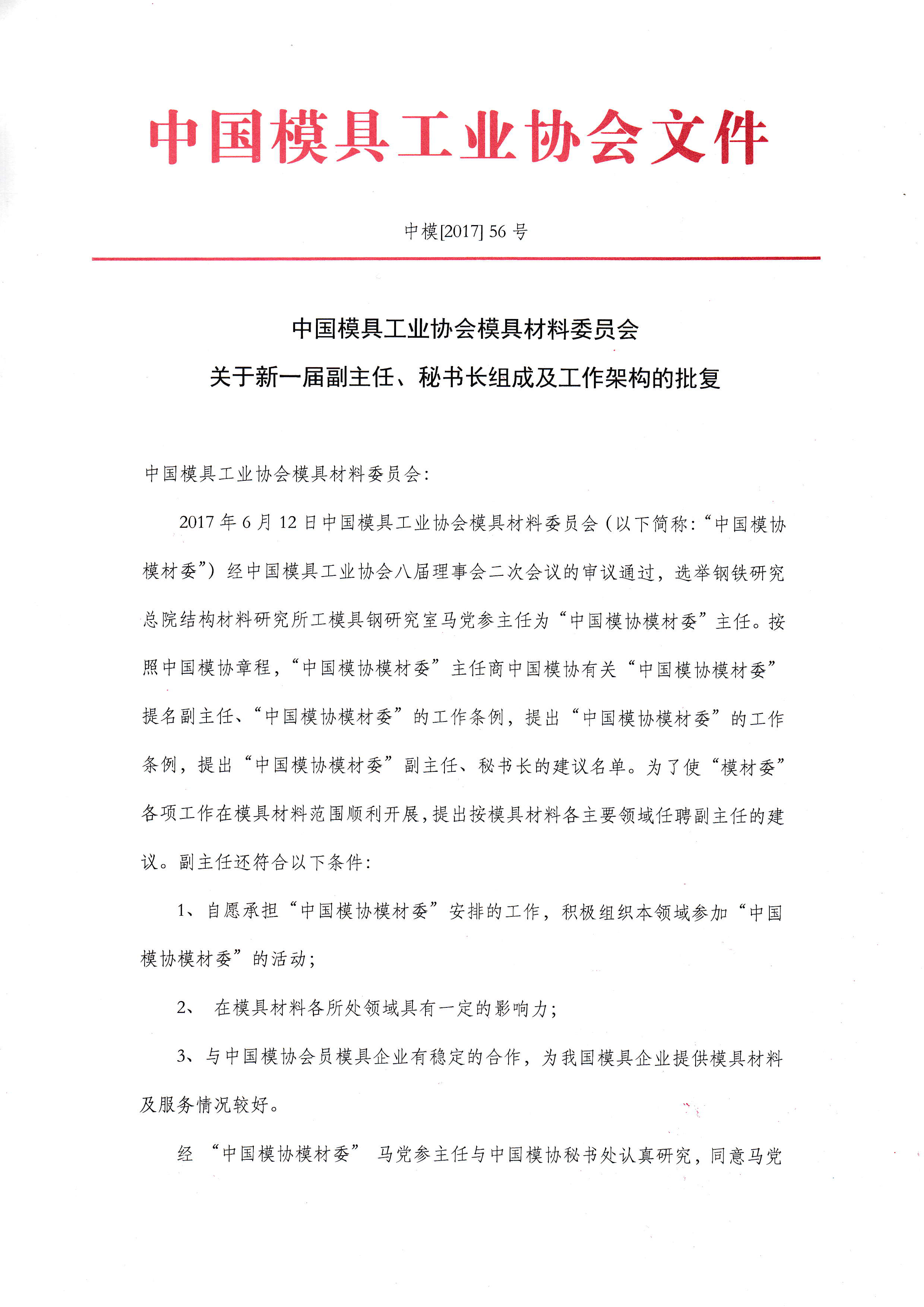 模具材料委員會關于新一屆副主任、秘書長組成及工作架構的批復