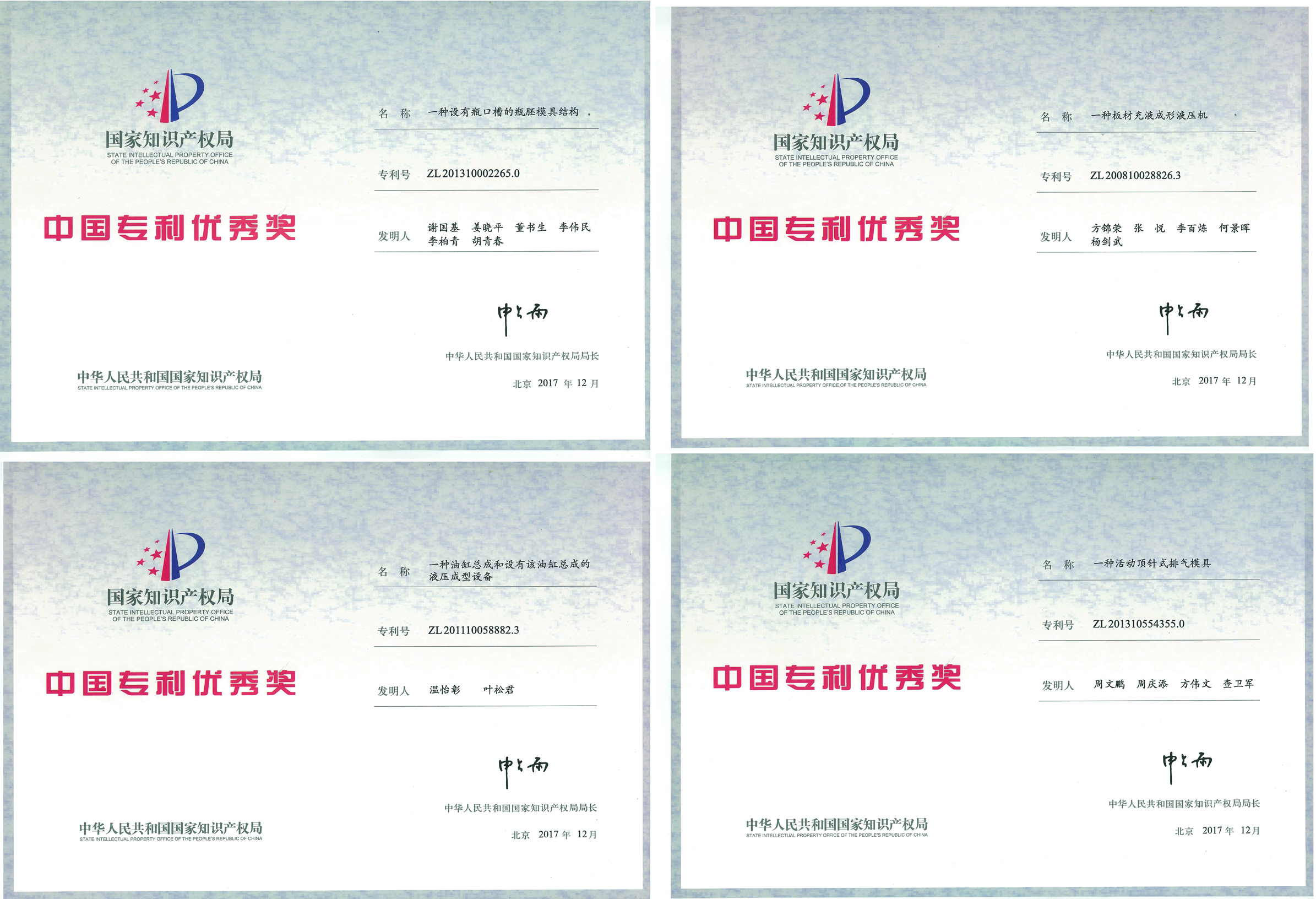 2017年3月,中國模具工業(yè)協(xié)會受廣東省知識產(chǎn)權(quán)局委托,根據(jù)專利標(biāo)準(zhǔn)化程度、國內(nèi)首創(chuàng)技術(shù)突破能力和專利實施許可推廣,圍繞提出的專利技術(shù)以及經(jīng)濟效益顯著性等情況,向國家知識產(chǎn)權(quán)局推薦了廣東省的4家模具及相關(guān)企業(yè)。2017年12月,國家知識產(chǎn)權(quán)局發(fā)布【第十九屆中國專利獎授獎的決定(國知發(fā)管字(2017)77號)】,廣東星聯(lián)精密機械有限公司的“一種設(shè)有瓶口槽的瓶胚模具結(jié)構(gòu)”、佛山市新鵬工業(yè)服務(wù)有限公司的“一種活動頂針式排氣模具”、佛山市恒力泰機械有限公司的“一種油缸總成和設(shè)有該油缸總成的液壓成型設(shè)備”以及佛山市康思達(dá)液壓機械有限公司的“一種板材充液成形液壓機”榮獲“中國專利優(yōu)秀獎”。