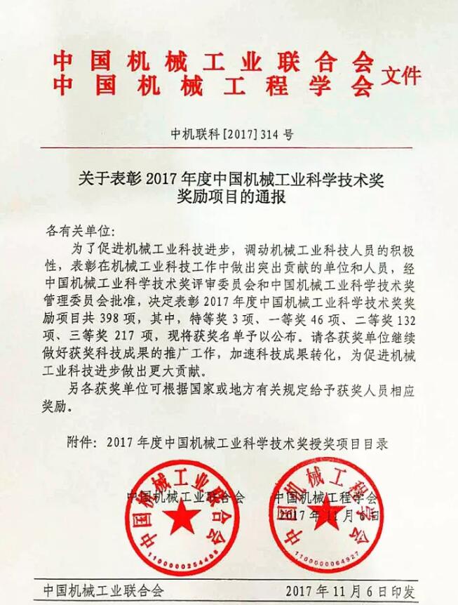 2017年度“中國機械工業科學技術獎”評審工作已經結束,經過各專業評審組初評和評審委員會終評,共評出獎勵項目398項,其中,特等獎3項、一等獎46項、二等獎132項、三等獎217項。現將中國模具工業協會會員單位的獲獎名單予以公布。