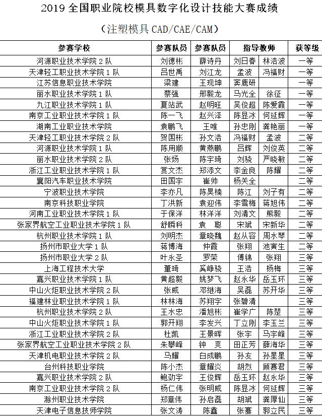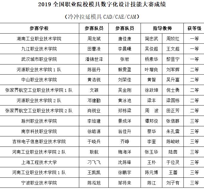 2019全國職業(yè)院校模具數(shù)字化設(shè)計技能大賽成績