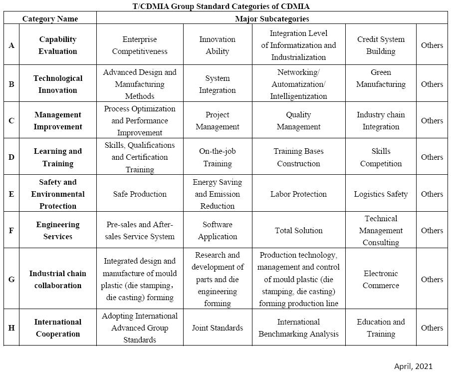 The group standards of CDMIA, T/CDMIA, are proposed and compiled by CDMIA according to the demand of market and innovation through organizing and coordinating the market entity of the die and mould industry and related industries. T/CDMIA group standards are also unified managed, independently formulated and issued by CDMIA, and provides for the society to voluntarily adopted. T/CDMIA group standards have been registered in China's national standards organization. T/CDMIA group standards are positioned as market-oriented and Innovative leading standards. T/CDMIA group standards focus on the transformation of scientific research achievements, concentrate on leading technology, collaborative standards, and integrated standards; T/CDMIA group standards focus on life cycle management standards, aim at promoting advanced standards of die and