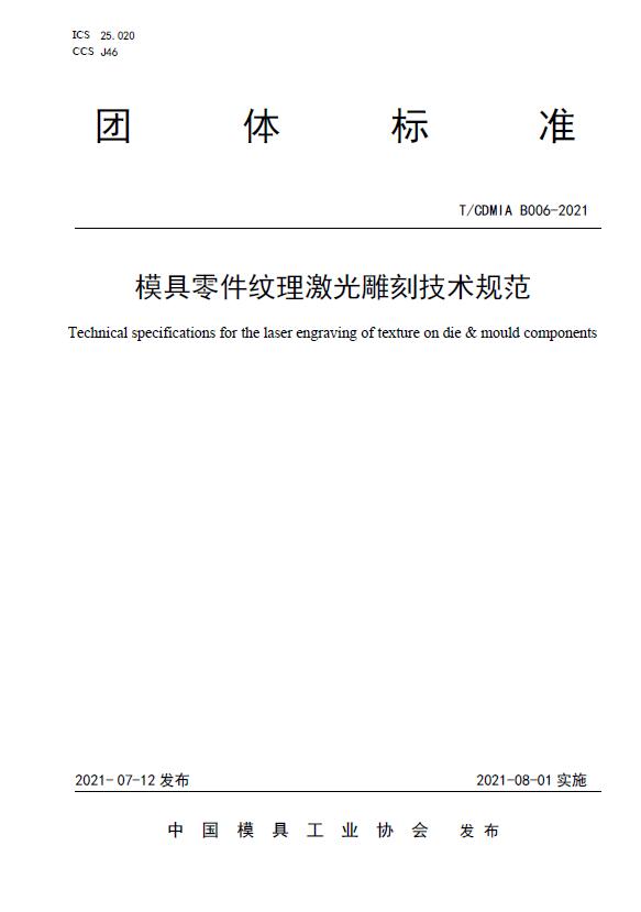 中國模協標準T/CDMIA B006-2021模具零件紋理激光雕刻技術規范