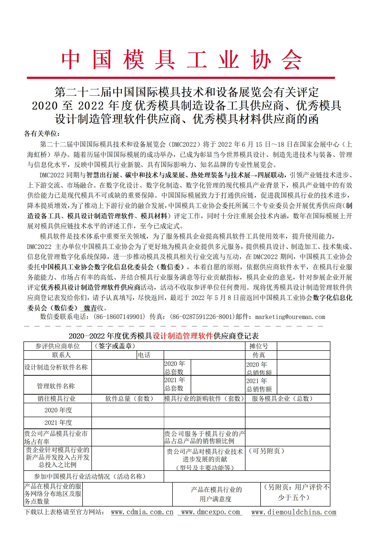第二十二屆中國國際模具技術(shù)和設(shè)備展覽會有關(guān)評定 2020至2022年度優(yōu)秀模具制造設(shè)備工具供應(yīng)商、優(yōu)秀模具設(shè)計制造管理軟件供應(yīng)商、優(yōu)秀模具材料供應(yīng)商的函 |