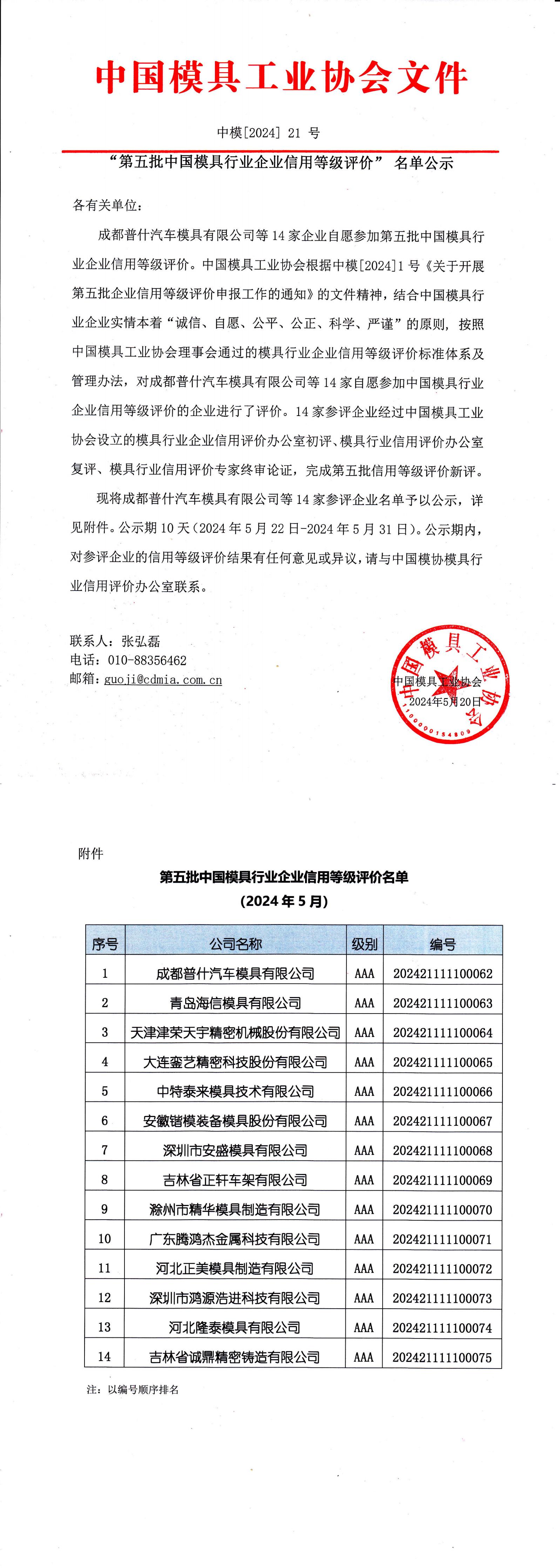 “第五批中國模具行業企業信用等級評價”名單公示