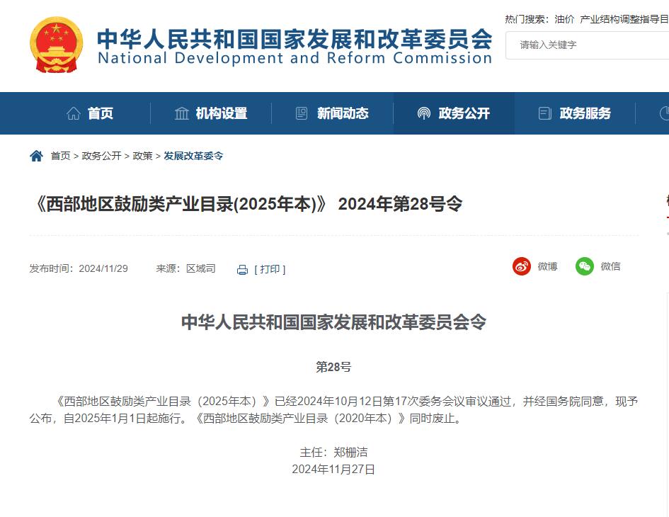 《西部地區鼓勵類產業目錄(2025年本)》 2024年第28號令